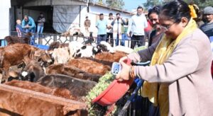 कुष्ठाश्रम के बाद श्रीमती ऋतु खण्डूडी भूषण जी शिवराजपुर स्थित आकृति गौशाला पहुँचीं, जहाँ उन्होंने गौ सेवा करते हुए गायों को चारा एवं गुड़ खिलाया। साथ ही गौशाला में कार्यरत कर्मचारियों एवं सेवा कार्य में लगे लोगों को राशन सामग्री वितरित कर उनका उत्साहवर्धन किया। उन्होंने कहा कि गौ सेवा भारतीय संस्कृति का अभिन्न अंग है और इससे करुणा, संवेदना एवं सेवा भाव की भावना सुदृढ़ होती है।